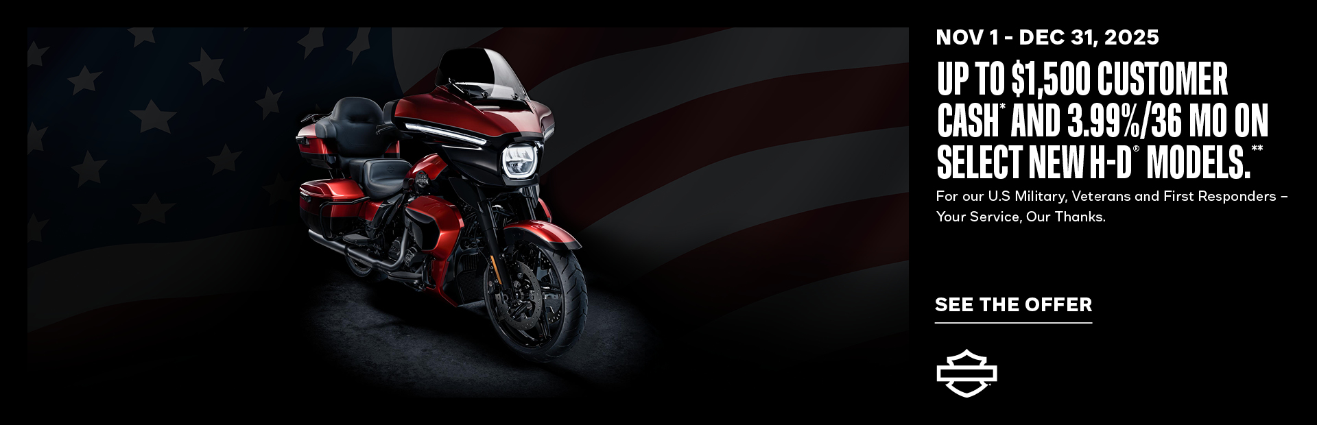 *$1,000 incentive valid towards the purchase price of select new, untitled Street Glide and Road Glide motorcycles, $1,500 incentive valid towards the purchase price of select new, untitled Street Glide Ultra motorcycles, or $750 incentive valid towards the purchase price of select new, untitled Pan America 1250 Special motorcycles, all available and in stock at participating H-D dealers in the continental U.S. including Hawaii and Alaska. At participating dealers only. Eligible customers must visit H-D.com/Military or H-D.com/firstrespondersoffer and validate through the ID.me button to receive H-D Hero code. This promotional offer is valid for the named party only and is non-transferable. Offer valid on purchases made on and between October 1, 2025 to December 31, 2025. Offer cannot be used towards the down payment on a motorcycle. Limit one offer per eligible customer and per eligible motorcycle purchase per year. Offer not valid on previous purchases or future motorcycle orders after December 31, 2025. Please see your authorized Harley-Davidson dealership to determine what offers, discounts or promotions, such as Harley-Davidson finance offers, can be combined with this Offer. The unique ID.me H-D Hero Offer code must be presented at time of purchase to be eligible. Harley-Davidson and/or dealer are not responsible for lost or stolen offers. Offer is subject to change at any time without notice. Void where prohibited or restricted by law. Cannot be redeemed for cash or cash equivalent and is non-refundable.
